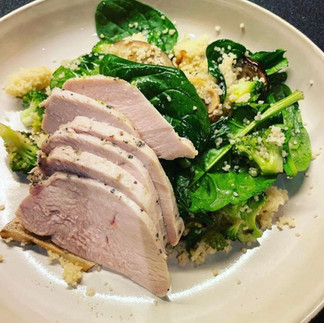 Middagstips: Kalkunfilet, cous cous salat med stekte grønnsaker og kyllingsaus.